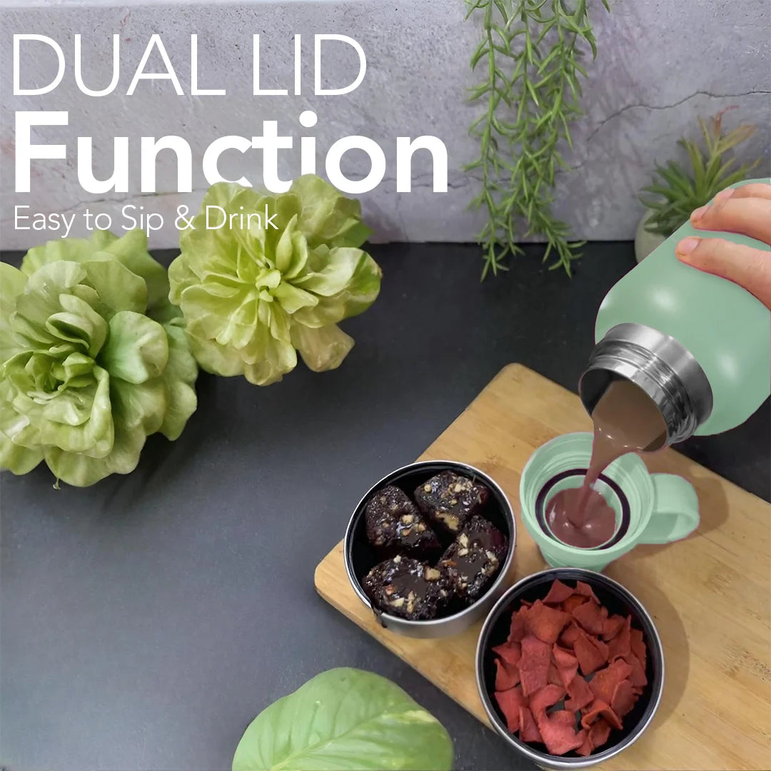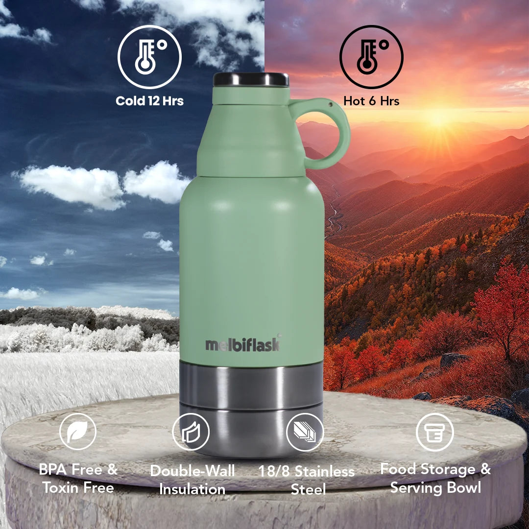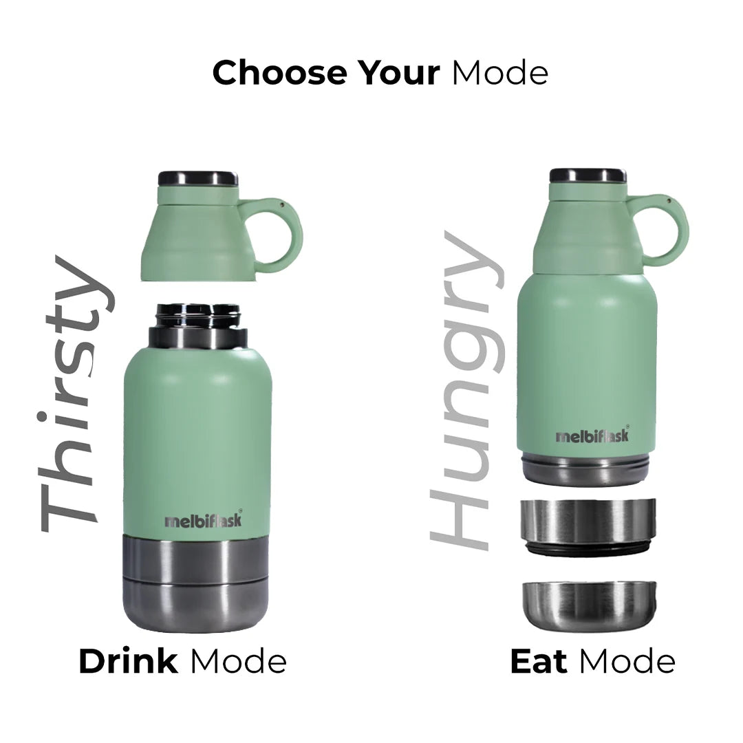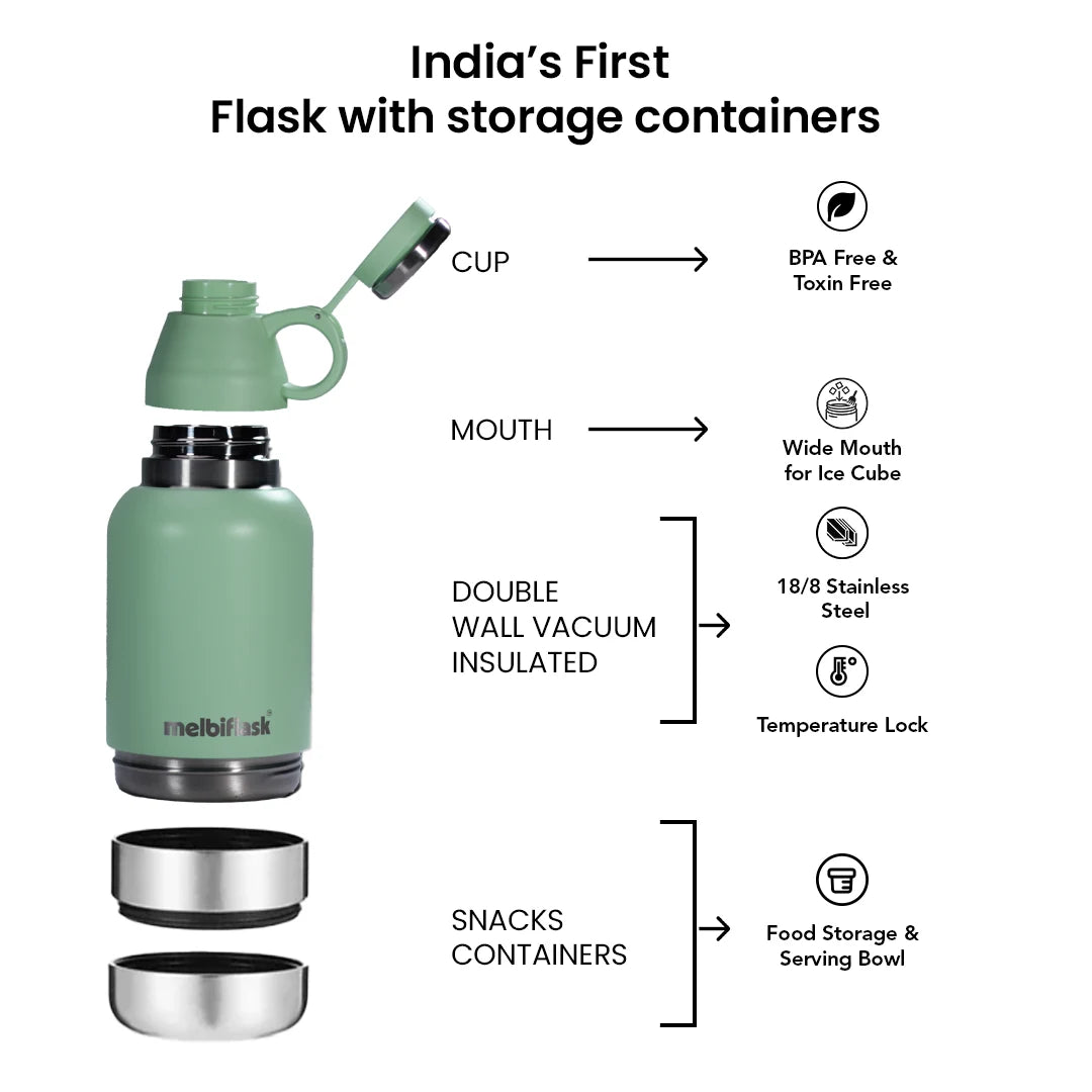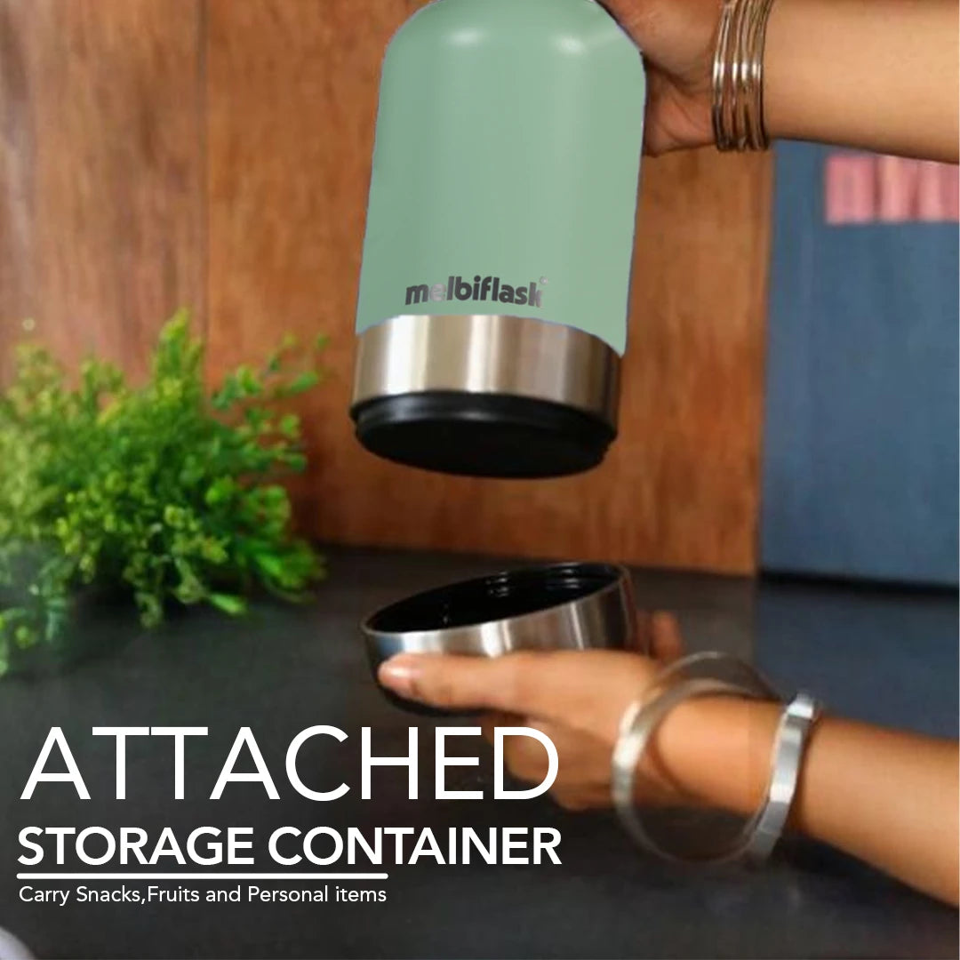 3-IN-1 FLASK WITH STORAGE - MelbiFlask 1L Insulated Stainless Steel Flask Bottle has 2 detachable bowls at the bottom to your carry snacks, medicines, Tea bags, Baby Food etc. Plus the twist-off cap on the top works great as a drinking cup. This perfect 3-in-1 combo ensures that you stay hydrated.